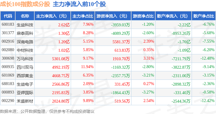 资金流向方面,成长100(980080)指数成份股当日主力资金净流出合计70.78亿元,游资资金净流入合计35.82亿元,散户资金净流入合计34.73亿元。成份股资金流向详情见下表:
