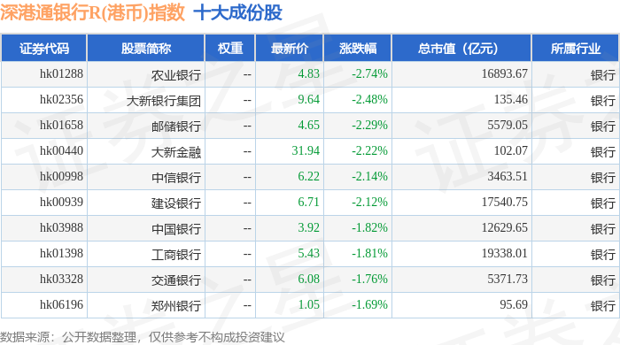 深港通银行R(港币)(483082)指数十大成份股详情如下: