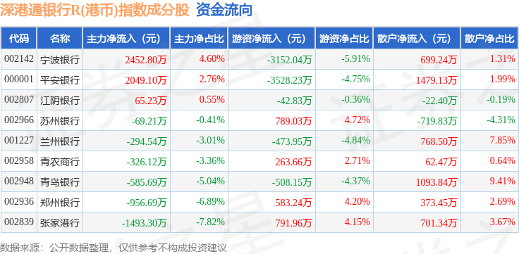 资金流向方面,深港通银行R(港币)(483082)指数成份股当日主力资金净流入合计841.58万元,游资资金净流出合计5277.31万元,散户资金净流入合计4435.73万元。成份股资金流向详情见下表: