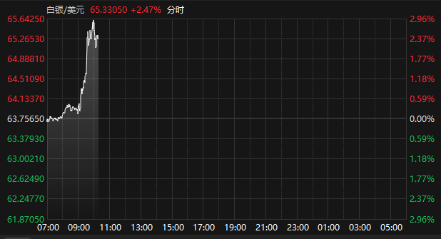 上证报中国证券网讯 据Choice数据,12月17日,国际现货白银站上65美元/盎司关口,截至10:17报65.33美元/盎司,日内涨超2%,续创历史新高。