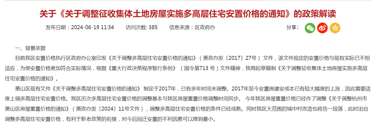 2024年6月,考虑到人工费用等建造成本的不断攀升的因素,萧山区曾时隔7年调整了集体土地房屋的多高层住宅安置价格,安置价格均上调约10%,同时废止了2017年的旧政策文件。