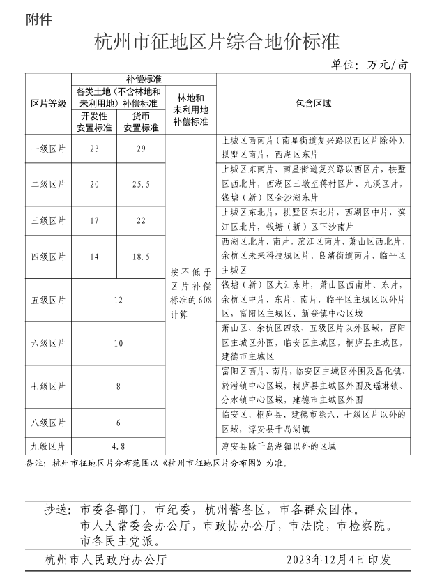 杭州现行的征地补偿标准按照一级至九级区片划分,一至四级的征地区片的安置方式有开发性安置、货币安置两种,一级区片的货币安置标准高达29万元/亩。