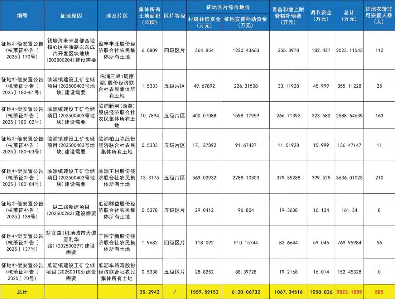 12月已发布8批征地补偿安置公告,涉及盈丰、临浦、瓜沥、宁围街道,总补偿费用合计约9823万元,单笔最高超3600万,征地农转非可安置人数共有585人。