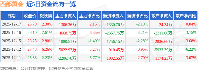 证券之星消息,截至2025年12月17日收盘,西部黄金(601069)报收于26.7元,上涨2.3%,换手率2.59%,成交量22.95万手,成交额6.08亿元。