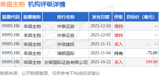 截至2025年12月18日收盘,荣昌生物(09995.HK)报收于76.7港元,下跌1.03%,成交量133.52万股,成交额1.03亿港元。投行对该股的评级以增持为主,近90天内共有2家投行给出增持评级,近90天的目标均价为92港元。中泰证券最新一份研报给予荣昌生物增持评级。