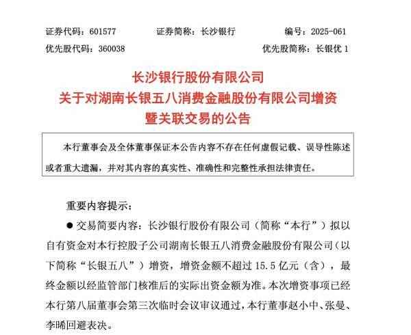 12月15日晚间,长沙银行发布公告,为增强长银五八的资本实力与风险抵御能力,推动其健康可持续发展,该行拟以自有资金对其进行增资,增资金额不超过15.5亿元,最终出资金额以经监管部门核准后的实际出资金额为准。本次增资事项已通过董事会审议,后续尚需提交该行股东会审议通过后,再报请监管部门批准后才能实施。