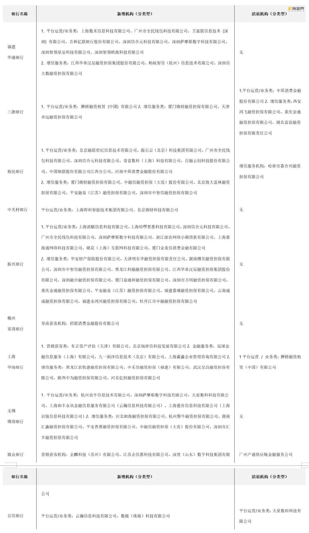 其中,华通、振兴、裕民等新增大量场景/流量平台,同时集中新增融资担保公司,部分叠加保险公司,强化信贷风控与合规增信。而民营银行的跨业态合作增多,比如华瑞银行合作冠球金融信息服务(上海)、九一润泽信息技术(北京)等。