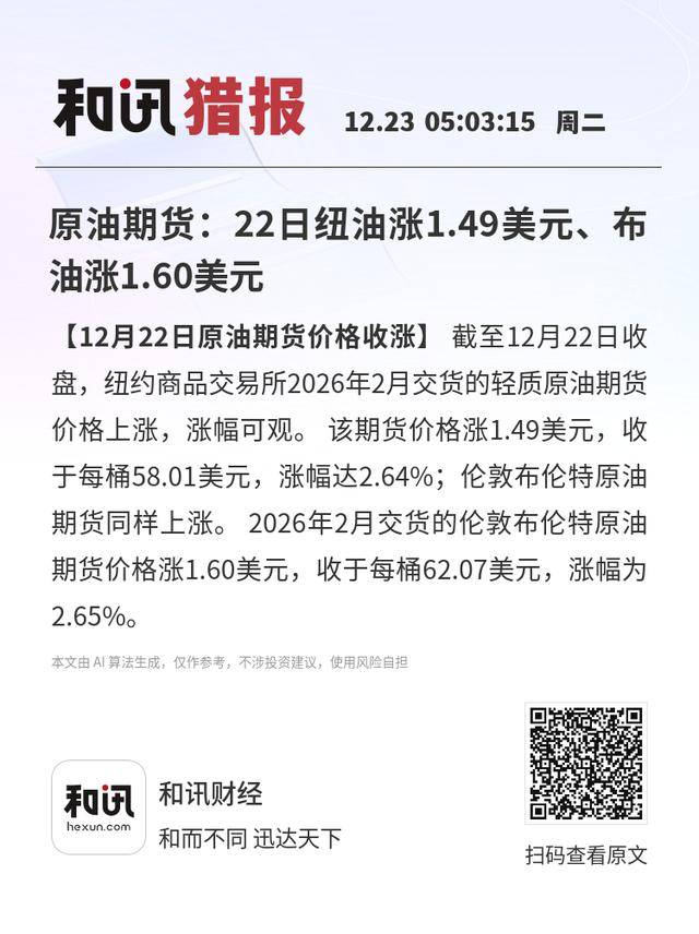 【12月22日原油期货价格收涨】截至12月22日收盘,纽约商品交易所2026年2月交货的轻质原油期货价格上涨,涨幅可观。该期货价格涨1.49美元,收于每桶58.01美元,涨幅达2.64%;伦敦布伦特原油期货同样上涨。2026年2月交货的伦敦布伦特原油期货价格涨1.60美元,收于每桶62.07美元,涨幅为2.65%。