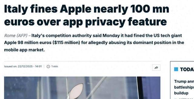 12月22日,据多家外媒报道,意大利竞争与市场管理局(AGCM)对外宣布了一项重大处罚决定,对苹果公司、Apple Distribution International以及苹果意大利公司处以高达9863.5万欧元的罚款,处罚缘由是这些公司存在滥用市场支配地位的行为。