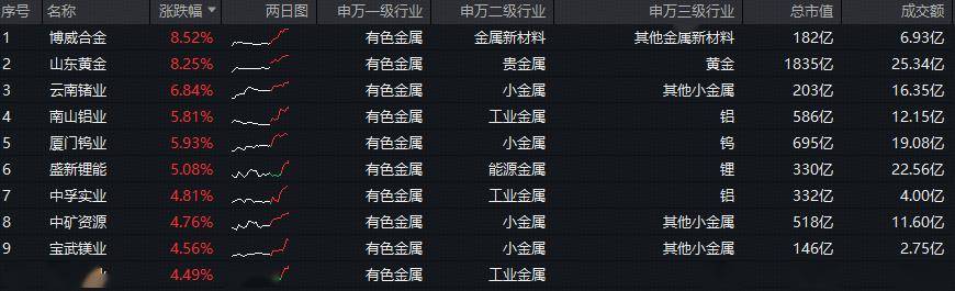 成份股方面,博威合金、山东黄金领涨超8%,云南锗业涨逾6%,南山铝业、厦门钨业、盛新锂能涨超5%。权重股方面,洛阳钼业涨超2%,中国铝业涨逾1%,紫金矿业飘红。