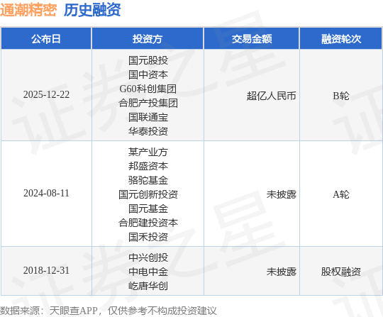 证券之星消息,根据天眼查APP于12月22日公布的信息整理,芜湖通潮精密机械股份有限公司B轮融资,融资额超亿人民币,参与投资的机构包括国元股投,国中资本,G60科创集团,合肥产投集团,国联通宝,华泰投资。