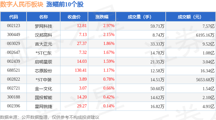证券之星消息,12月23日数字人民币板块较上一交易日下跌1.43%,创识科技领跌。当日上证指数报收于3919.98,上涨0.07%。深证成指报收于13368.99,上涨0.27%。数字人民币板块个股涨跌见下表: