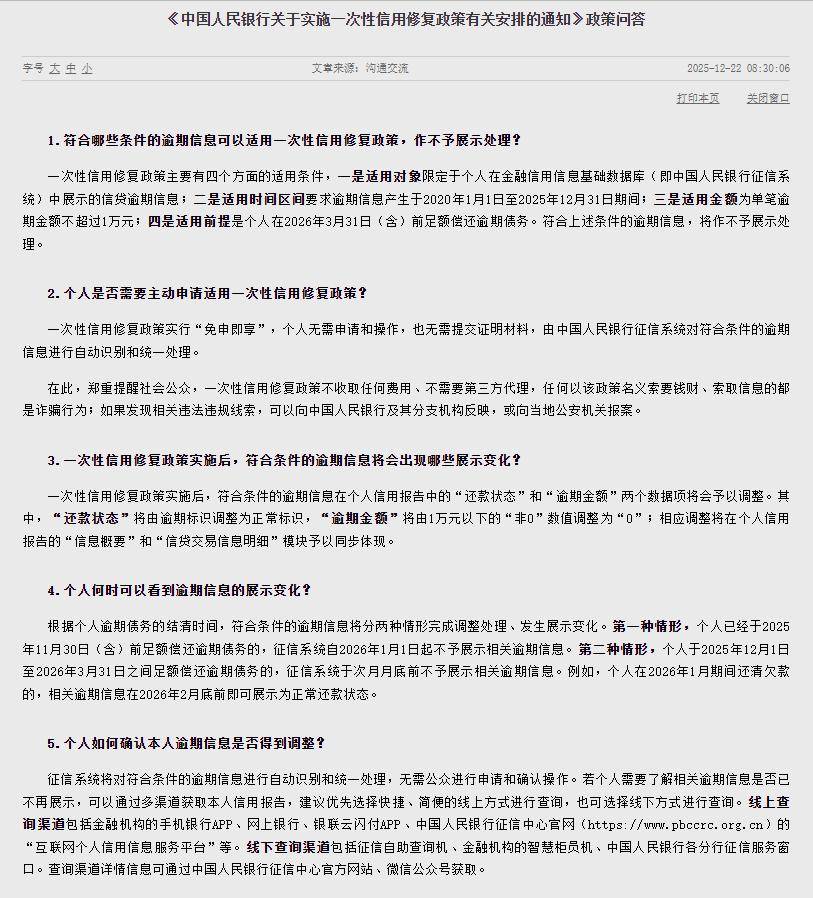 此次央行发布的“一次性信用修复政策”重点解决了小额贷款逾期记录的“消除”:对于2020年1月1日至2025年12月31日期间,单笔金额不超过10000元人民币的个人逾期信息,个人于2026年3月31日(含)前足额偿还逾期债务的,金融信用信息基础数据库将不予展示。其中个人于2025年11月30日(含)前足额偿还逾期债务的,金融信用信息基础数据库自2026年1月1日起不予展示相关逾期信息:个人于2025年12月1日至2026年3月31日之间足额偿还逾期债务的,金融信用信息基础数据库于次月月底前不予展示相关逾期信息。
