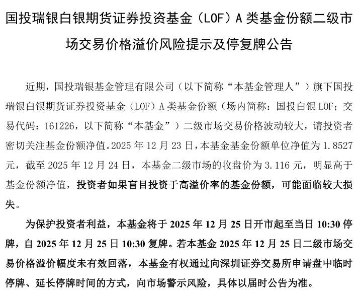 为维护投资者利益,该基金将于2025年12月25日开市起至当日10:30停牌。若本基金在公告日当日二级市场交易价格溢价幅度未有效回落,其有权采取向深圳证券交易所申请盘中临时停牌、延长停牌时间等措施以向市场警示风险。
