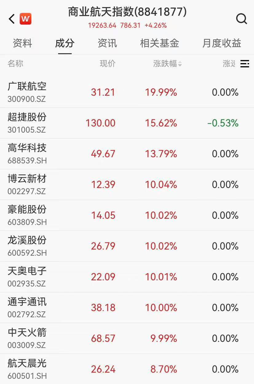 商业航天再起涨停潮,广联航空20cm涨停,神剑股份晋级6连板,九鼎新材3连板,航天软件、航天工程、冲天火箭等10余股涨停。