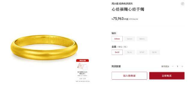 截至12月24日下午2点,周大福、周生生、老庙黄金等头部品牌足金报价均站上1410元/克,叠加工艺费后,终端金价再攀新高。以周大福传承系列一款约55克的金镯子为例,产品总价已高达75963元,接近7.6万元,令不少普通消费者望而却步。