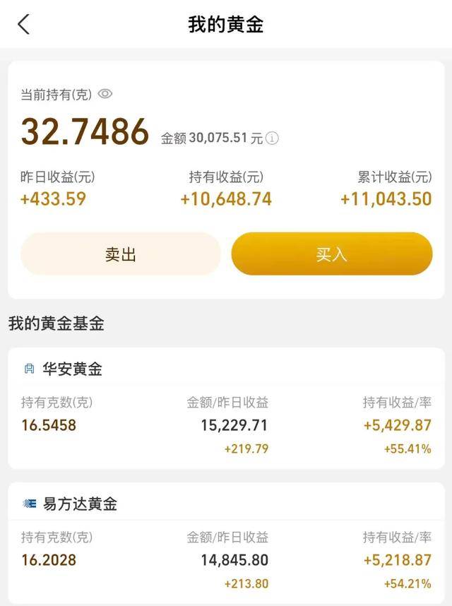 还有投资者于今年1月、2月分别买了两只黄金类ETF的联接基金,当时成本合计不到两万元,如今已经赚了11043.5元,收益比例超50%。仅12月23日一天,就赚了433.59元。该投资者兴奋地表示:“早知道黄金收益这么稳,还炒啥股票啊,直接买黄金就好了,还不用辛苦盯盘。”