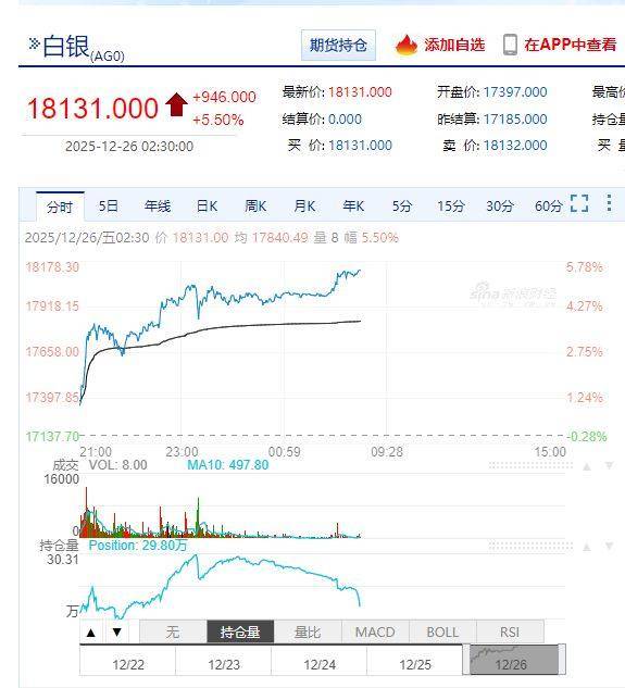 每日经济新闻消息,12月25日晚间,贵金属期货走强,截至12月26日凌晨2点30分收盘,白银报18131元/千克,再创新高,涨幅5.50%。