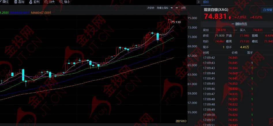 今日,现货白银跳空高开,突破75美元,再创历史新高。截至目前,现货白银价格年内涨幅接近150%。