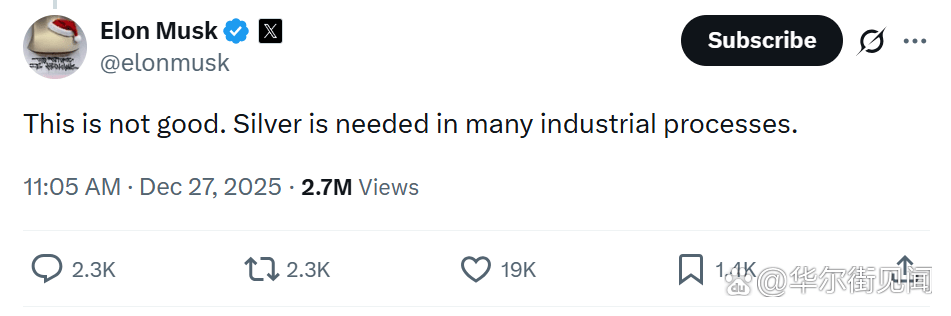 【白银价格狂飙,马斯克直言:这不好】本周白银首次逼近80美元/盎司,迅猛涨势远超黄金。12月27日,马斯克在社交媒体平台X上表达了担忧,直言这对工业发展“不是好事”。针对关于白银价格因“严重的全球供应短缺”而暴涨的讨论,马斯克评论称:“这不是好事。很多工业生产过程都需要白银。”