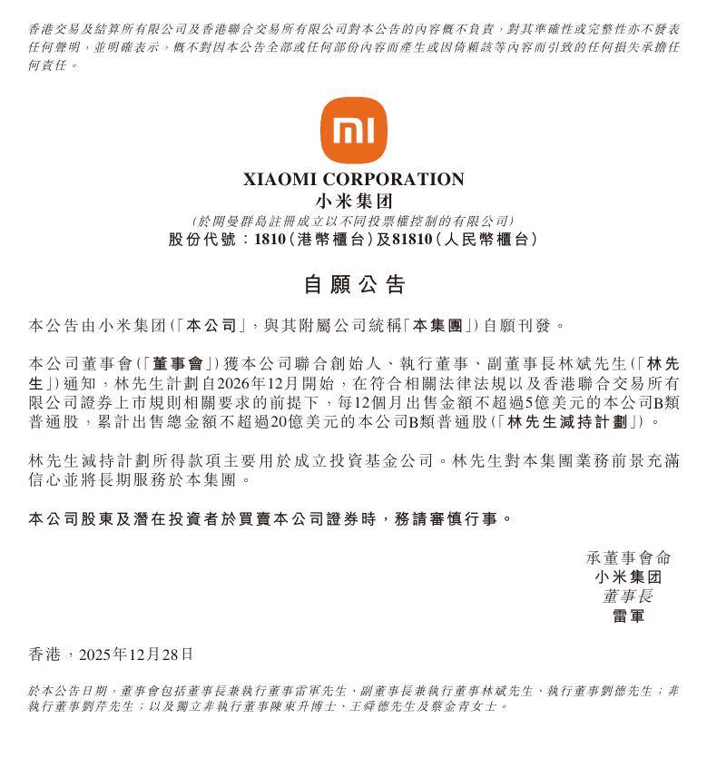 IT之家 12 月 28 日消息,小米集团今日在港交所公告,公司联合创始人、执行董事、副董事长林斌计划自 2026 年 12 月开始,在符合相关法律法规以及香港联合交易所有限公司证券上市规则相关要求的前提下,每 12 个月出售金额不超过 5 亿美元(IT之家注:现汇率约合 35.11 亿元人民币)的公司 B 类普通股,累计出售总金额不超过 20 亿美元(现汇率约合 140.46 亿元人民币)的公司 B 类普通股。