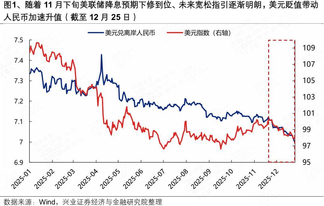 首先,随着11月下旬市场美联储降息预期下修到位、未来宽松指引逐渐明朗,美元再度走弱带动人民币加速升值。10月美国政府停摆对于TGA账户的“抽水”、叠加数据空窗期下美联储降息表态趋于谨慎,曾一度引发市场流动性预期收紧,进而带动美元指数持续走强,成为当时美元兑人民币汇率继续下行的掣肘。而11月下旬以来,随着美国政府“开门”后流动性释放、12月美联储降息并开启技术性扩表,显著改善此前偏紧的流动性环境,叠加关键数据验证以及特朗普对于“影子主席”的表态进一步为后续宽松打开想象空间,美元指数见顶回落、快速下行破98,是近期人民币加速升值的重要推动。