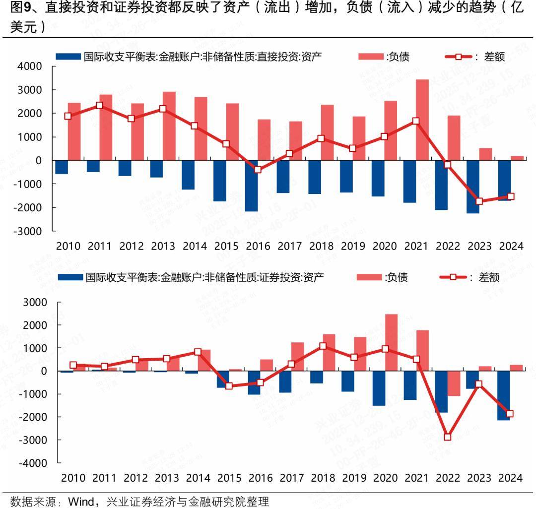 其二,价格通缩进一步引发的中国资产回报率下降,导致国内资金滞留海外、境外资本大幅流出,大量的资金未形成对人民币资产的配置需求、甚至造成打压,是此前人民币贬值的另一重要因素。一方面,前几年国内出口商通过贸易经常项顺差取得的外汇,有较大规模未进行结汇形成人民币收入,而是选择了持有各类预期回报率更高的海外资产。另一方面,国际收支平衡表中直接投资与证券投资项目中的资产(国内持有的境外资产)、负债(境外持有的国内资产)两项均反映了近几年资金流出增多、流入减少的趋势。这些现象的背后,共同指向了国内与国外投资者对人民币资产回报率的担忧。