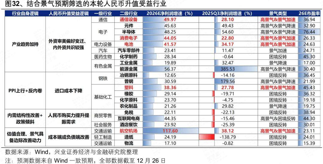 7、本轮人民币升值受益的行业中,结合景气预期,重点关注四条线索:1)受益于外资审美偏好变迁、内外资共识较强的景气成长主线,包括AI硬件(通信设备、元件、半导体、消费电子)、优势制造业(电池、汽车零部件、化学制药)、有色(工业金属、能源金属);2)国内PPI上行、“反内卷”与人民币升值带动进口成本下降共振受益的上游资源品,包括钢铁、化工(塑料、化学原料、农化制品、橡胶)等;3)人民币购买力提升与内需结构性改善共振的服务消费和高端消费领域,包括免税、电商、酒店餐饮等;4)当前估值合理、明年景气具备边际改善动力、且有望受益于人民币升值带来的成本端或负债端改善的行业,包括航空机场、造纸、物流等。