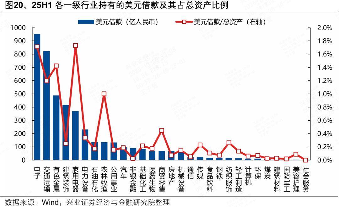 对于外币借款较多的行业,人民币升值将降低其负债成本。为了更好满足自身融资发展需要,或匹配跨境业务需求,不少上市公司选择进行外币借款,其中美元借款占比最高。在借款规模不变的情况下,人民币升值使得其需要花费更少的人民币以偿还外币借款。25H1持有美元借款较多的行业主要集中在电子、交运、有色、建筑、家电等一级行业,具体包括出口业务敞口较大、出于跨境业务货币匹配需求持有较高美元负债的消费电子、航运港口、白电、航空机场、物流、光学光电子、多元金融等,以及通过海外融资降低融资成本、拓宽融资渠道的建筑地产链(基础建设、房地产开发等)。