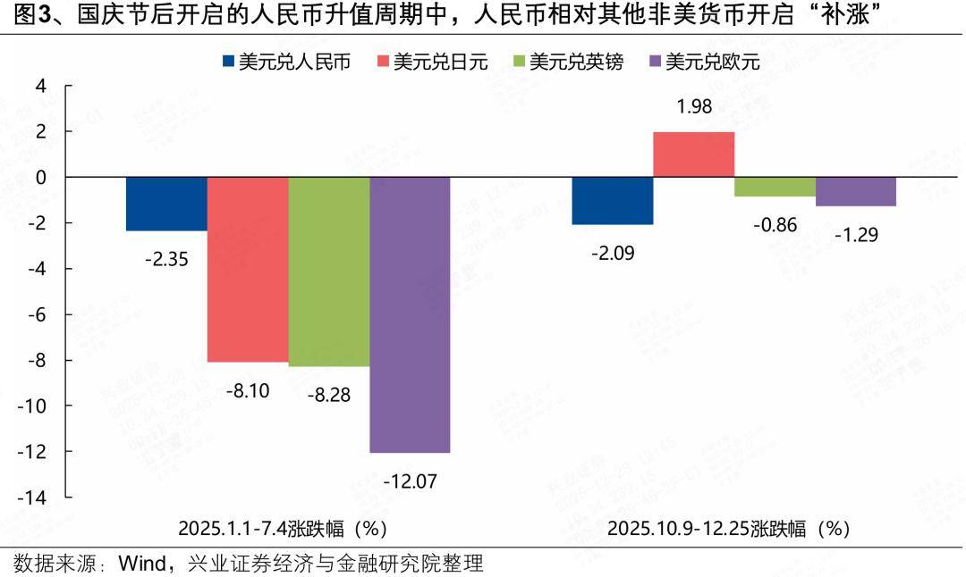 近期人民币加速升值引发市场关注。我们认为,背后主要反映的是美元再度走弱叠加年末“结汇潮”带动下,人民币相对其他非美货币的“补涨”,与市场对人民币升值的一致预期形成共振。