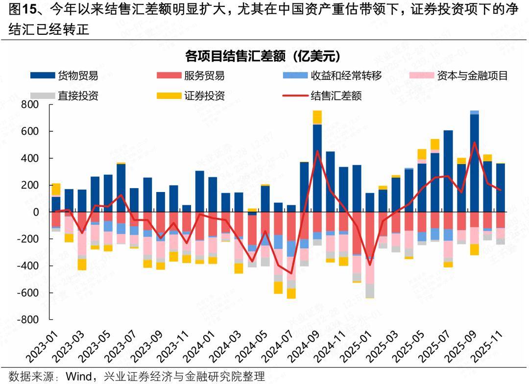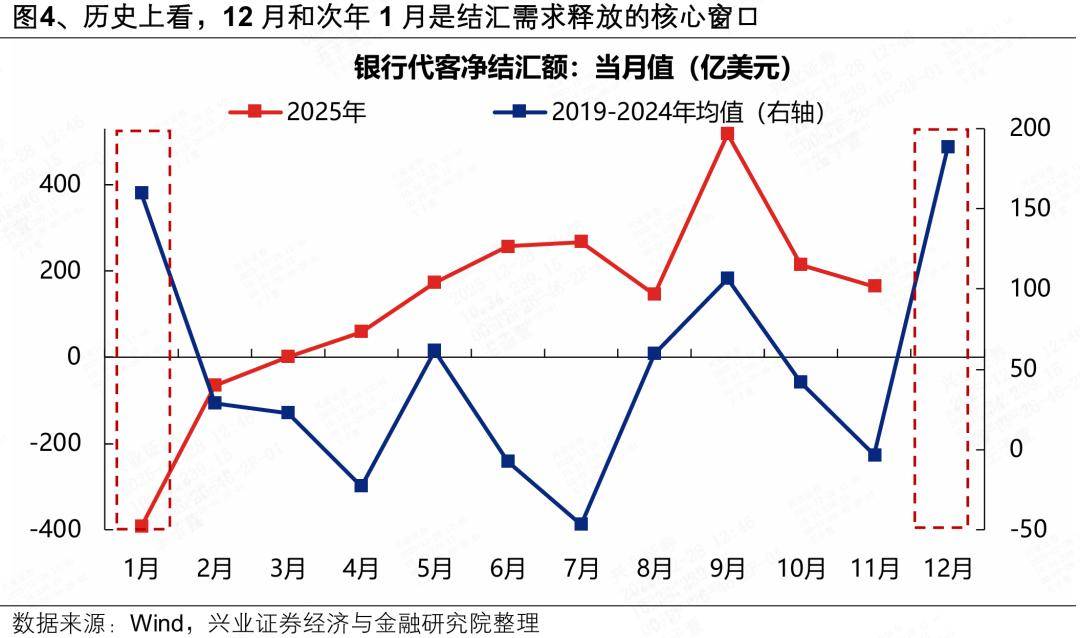 其次,在岁末年初“结汇潮”的带动下,外汇市场的供需关系也在助推市场对人民币升值的一致预期。岁末年初是出口企业传统的利润回笼与结汇旺季,企业本身存在较强的财务结算和工资支付需求,需要将持有的美元等外汇收入集中兑换为人民币。历史上看,每年的12月和次年1月是结汇需求释放的核心窗口,净结汇规模往往出现季节性增长,外汇市场供需关系对人民币升值的支持力度达到全年最高水平,叠加今年出口偏强下企业前期积累了丰厚的外汇收入,人民币升值预期将促使企业加速结汇操作,进而形成“升值→加速结汇→进一步升值”的自我预期强化。
