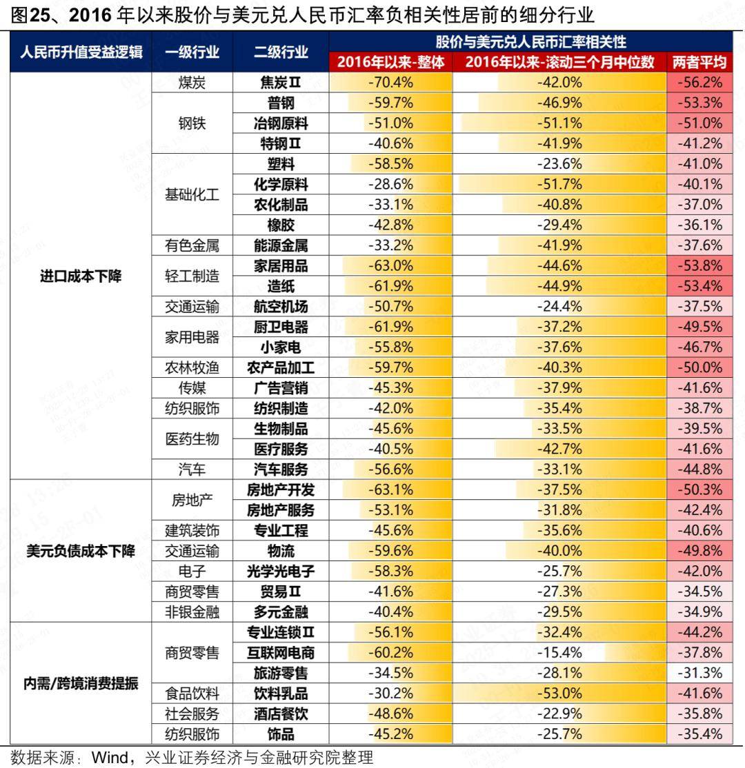 6、人民币升值影响行业配置的四个逻辑:盈利层面,1)人民币升值降低进口成本,原材料进口依赖度较高的上游资源品受益,包括煤炭、钢铁、部分化工品(塑料、化学原料、农化制品、橡胶)、能源金属、造纸等,以及航空机场等下游受益行业;2)人民币升值驱动外币负债成本下降,持有较多美元负债的行业受益,包括建筑地产链,以及物流、光学光电子、贸易、多元金融等;3)人民币升值提升国内居民购买力,内需驱动型和跨境消费型行业受益,包括跨境电商、免税、酒店餐饮、饰品等服务消费和高端消费领域。通过股价表现与人民币汇率相关性验证,上述行业在人民币升值期间确实能够被市场定价。估值层面,4)人民币升值吸引外资回流中国资产,外资审美发生变化后,当下的景气成长主线或仍将是受益于外资增配的核心方向,内外资审美共振有望驱动当前围绕景气和产业趋势展开的市场风格进一步强化。