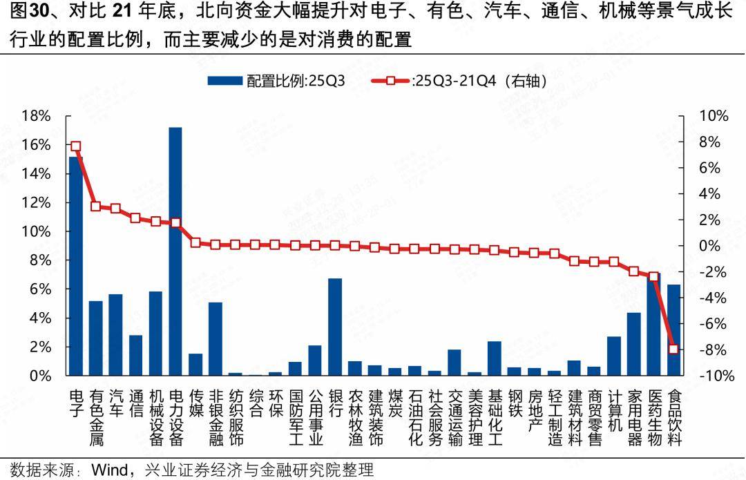 当前来看,伴随着中国新旧动能加速转换,外资对中国资产的审美也在发生深刻变化。相较于2021年底,外资近年来大幅提升对电子、有色金属、汽车、通信、机械等景气成长行业的配置比例,同时主要缩减对消费板块的配置。25Q3的流入中,外资同样遵循景气投资的思路,对电子、电力设备、有色金属、机械设备、通信环比配置比例提升较大。