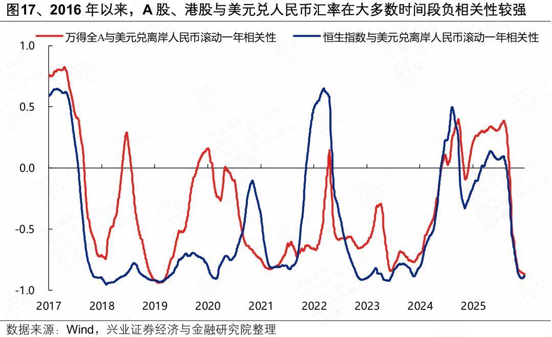 首先,从滚动一年相关性看,2016年以来A股、港股表现与美元兑人民币汇率在大多数时间段负相关性较强,即人民币升值阶段中国资产往往表现较好。汇率本质上是对国内外经济基本面相对强弱、资本流向等因素的共同定价结果,而这些因素对于汇率和股市的影响往往同向。