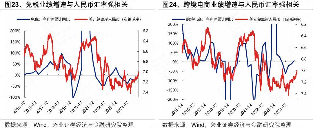 除了通过汇兑损益传导至净利润,人民币升值也能够带来国内居民购买力的提升,有助于内需驱动型和跨境消费型行业的需求释放。一方面带来跨境消费需求的释放,主要包括免税、跨境旅游、跨境电商等服务消费需求;另一方面对价格敏感度较高的可选消费品类的消费意愿会有较大提振,包括饰品、化妆品等高端消费需求。