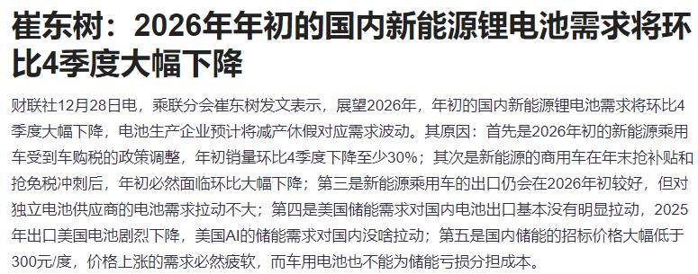 - 乘联分会崔东树发文表示,展望2026年,年初的国内新能源锂电池需求将环比4季度大幅下降,电池生产企业预计将减产休假对应需求波动。虽然我之前就认为电池一季度排产会环比下降,但30%这个数字还是略夸张,这可能也是就今天锂电材料走弱的关键原因,从管理层来看肯定是不希望锂电材料持续涨价从而导致电池涨价,压制新能车需求。
