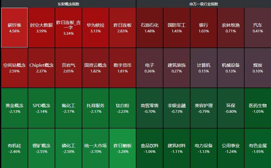 分行业来看,石油石化、国防军工、银行、农林牧渔、汽车等行业领涨,有色金属、公用事业、电力设备、建筑材料、食品饮料等行业领跌。