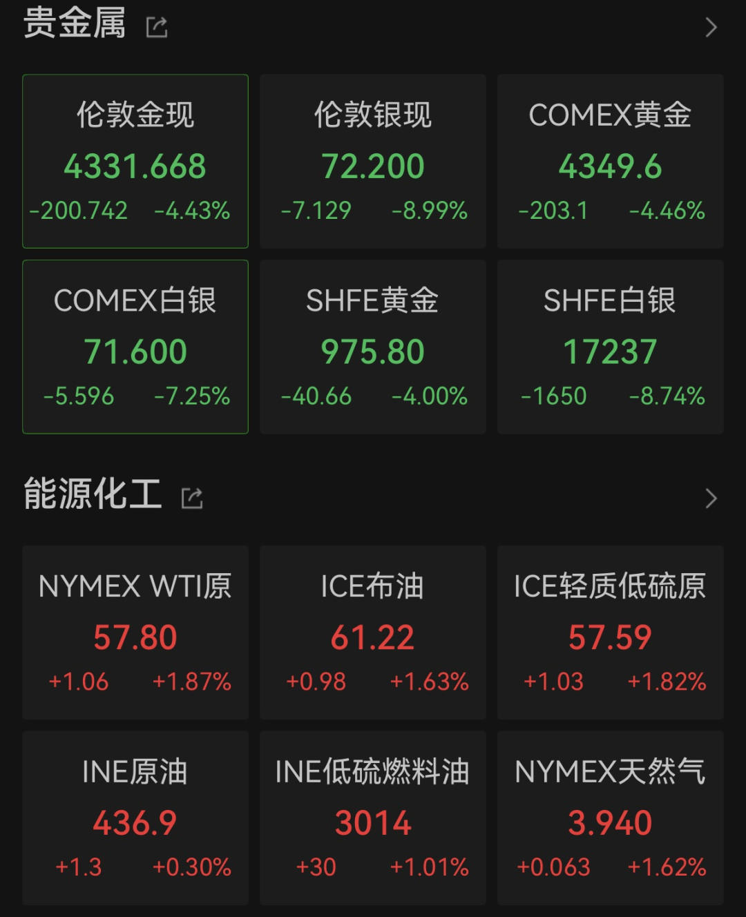 大宗商品方面,贵金属遭遇重挫。截至北京时间12月30日5:50,伦敦银现跌8.99%,伦敦金现跌4.33%。