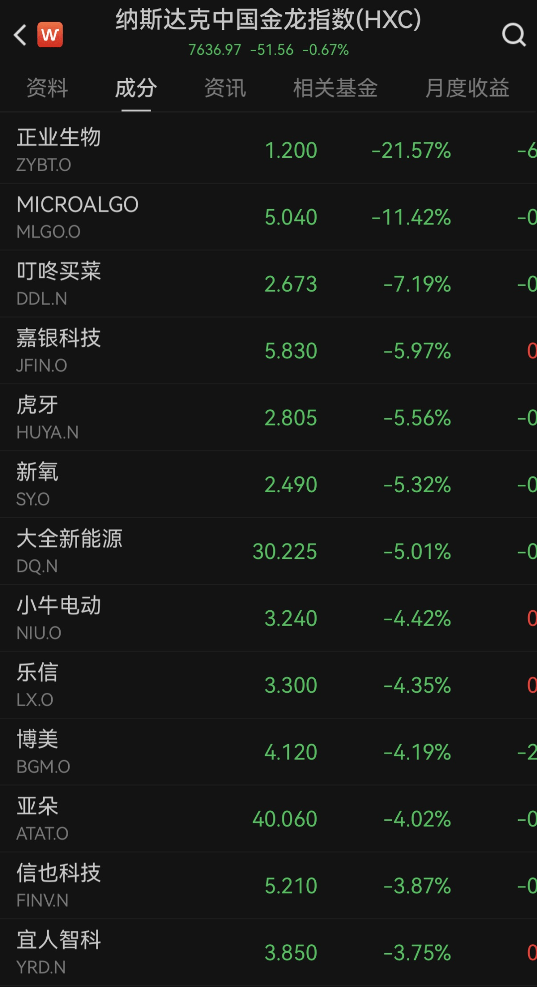 中概股多数下跌,纳斯达克中国金龙指数跌0.66%,万得中概科技龙头指数跌1.43%。热门中概股方面,叮咚买菜跌超7%,大全新能源跌超5%,脑再生科技涨超10%。