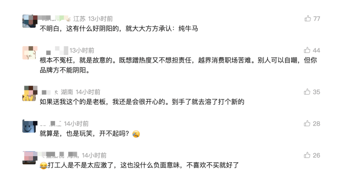 对于此事,网友们意见不一。有不少网友表示,周大福就是在故意阴阳“打工人”,认为“牛马”这个平日拿来自嘲的词,不应该被品牌拿来营销,称其是在“消费职场苦难”。