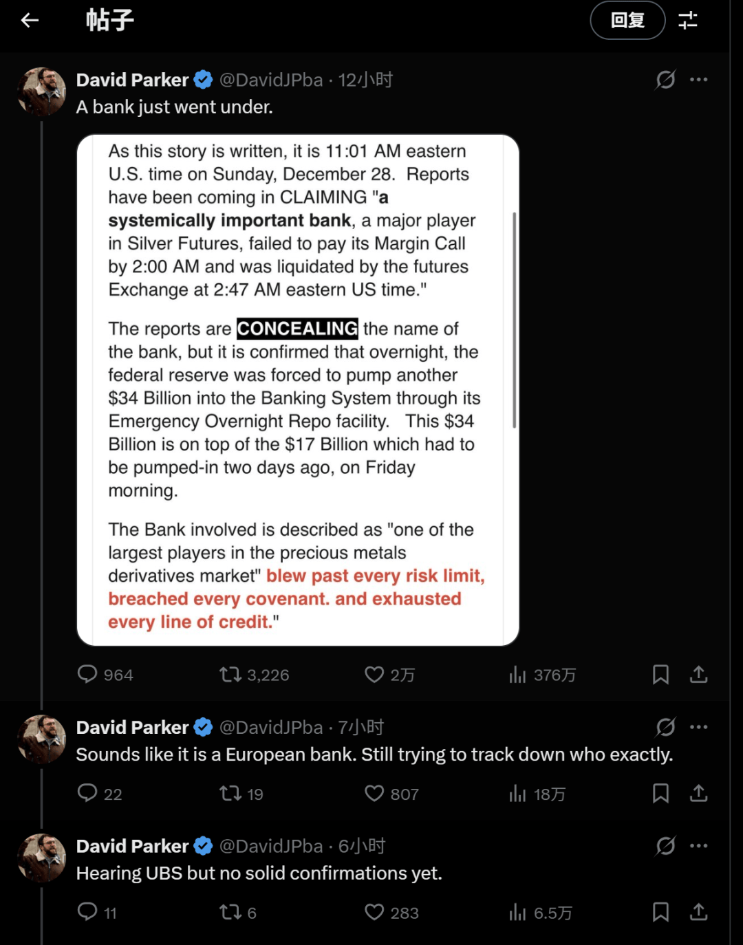 此后,转发该博客文章的用户称涉事银行是瑞银集团。不过每经记者向瑞银求证,对方予以否认,称“不是瑞银”。