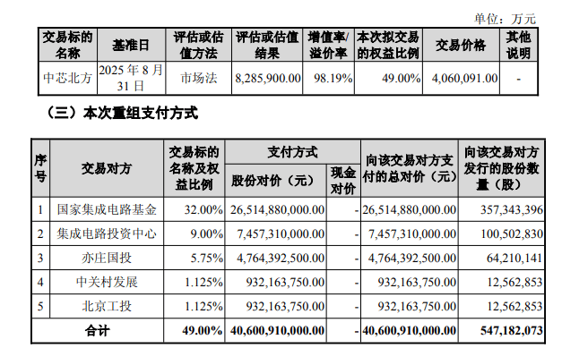 采用市场法评估,截至评估基准日2025年8月31日,中芯北方所有者权益账面值为418亿元,评估值为828亿元,评估增值410亿元,增值率/溢价率为98.19%。