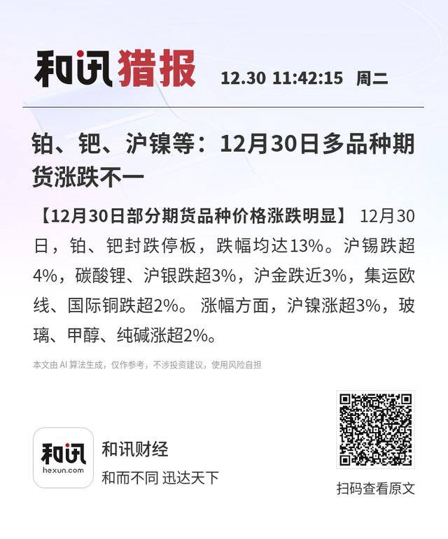 【12月30日部分期货品种价格涨跌明显】12月30日,铂、钯封跌停板,跌幅均达13%。沪锡跌超4%,碳酸锂、沪银跌超3%,沪金跌近3%,集运欧线、国际铜跌超2%。 涨幅方面,沪镍涨超3%,玻璃、甲醇、纯碱涨超2%。