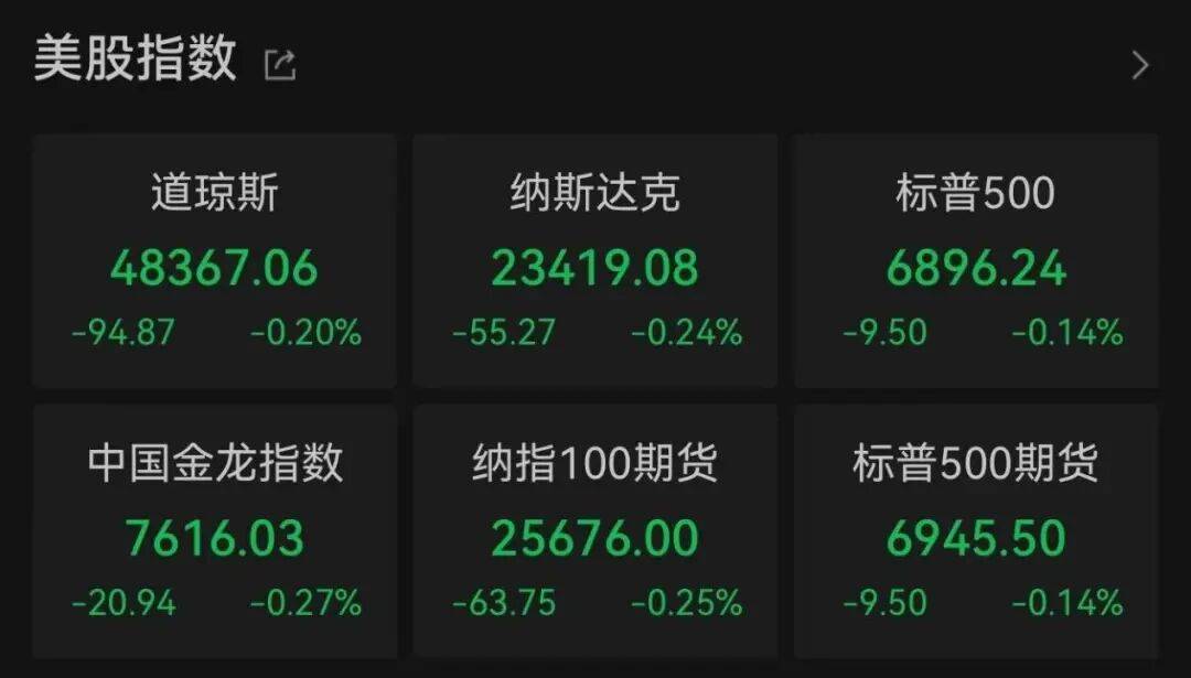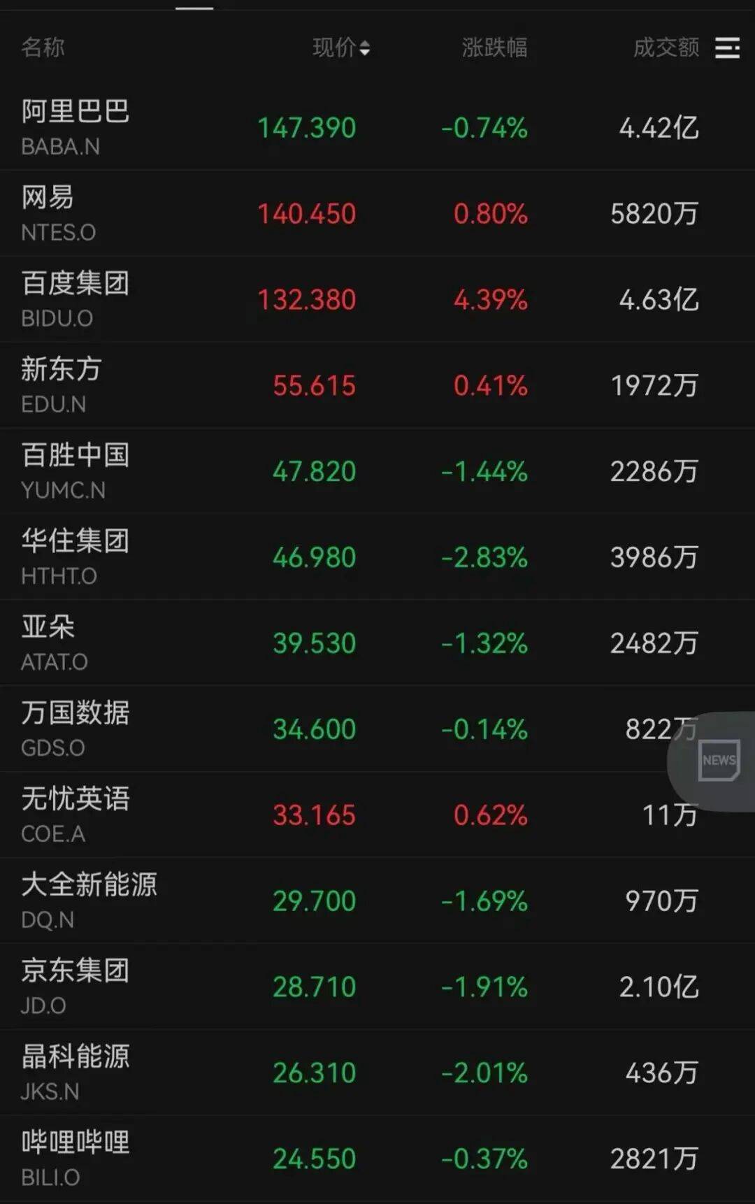 截至收盘,百度大涨4.39%,网易、新东方、无忧英语分别上涨0.80%、0.41%、0.62%;华住集团、晶科能源跌幅超2%,百胜中国、亚朵、京东集团跌幅超1%。