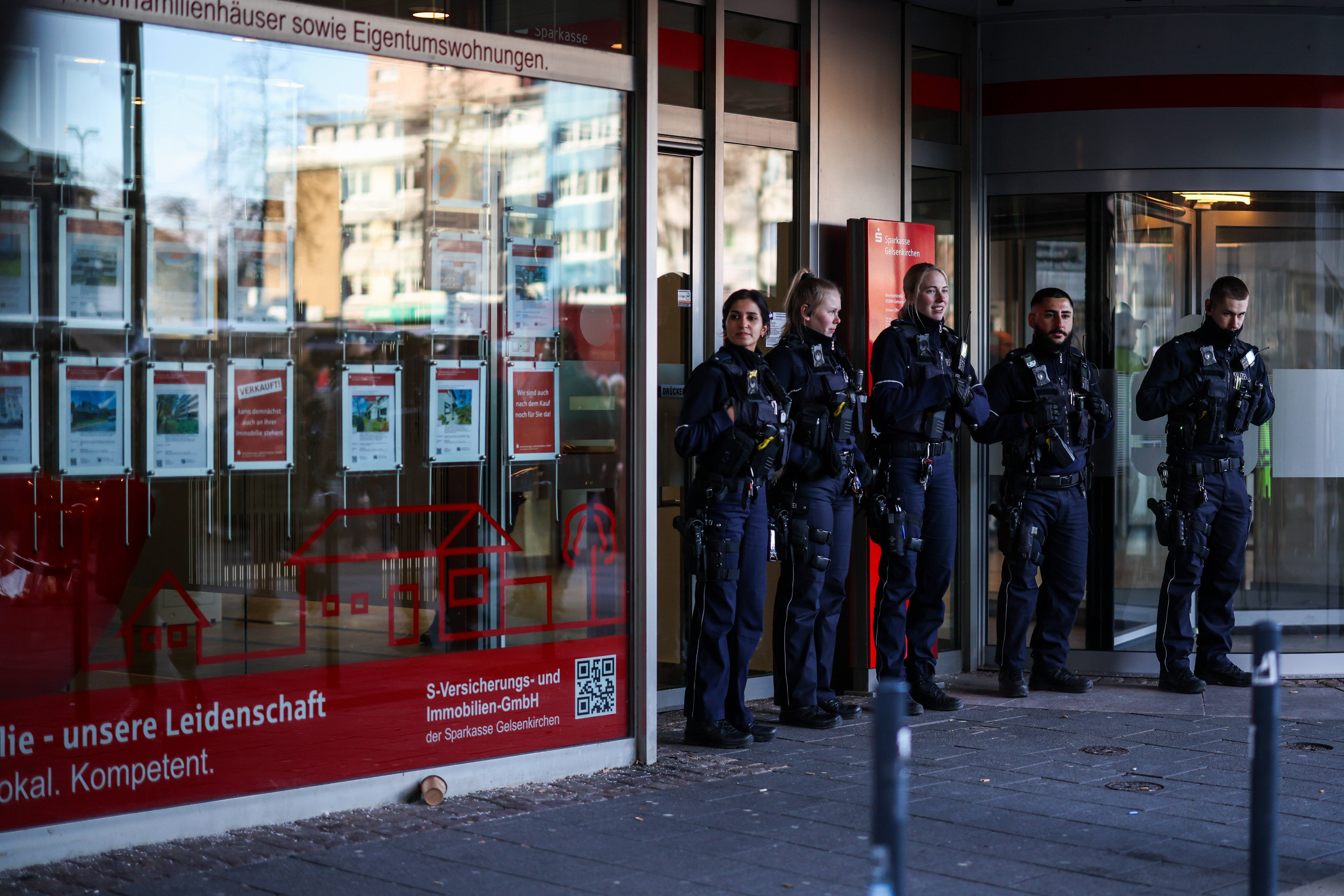 12月30日,在德国盖尔森基兴市,警察在遭窃银行外警戒。 新华社/美联
