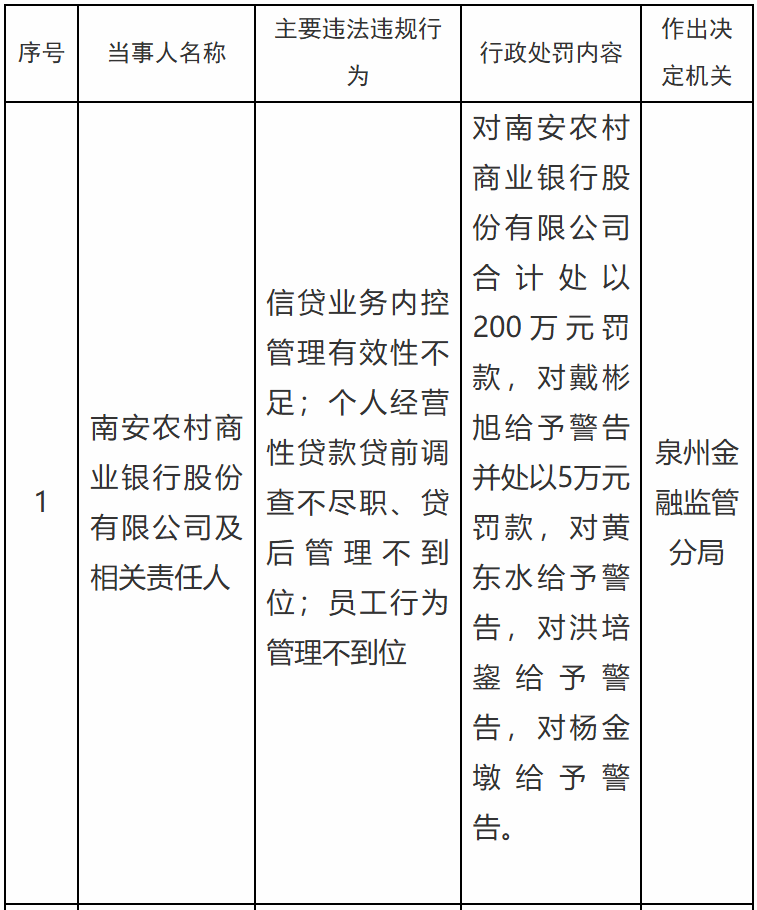南安农村商业银行主要违法违规行为包括:信贷业务内控管理有效性不足;个人经营性贷款贷前调查不尽职、贷后管理不到位;员工行为管理不到位。