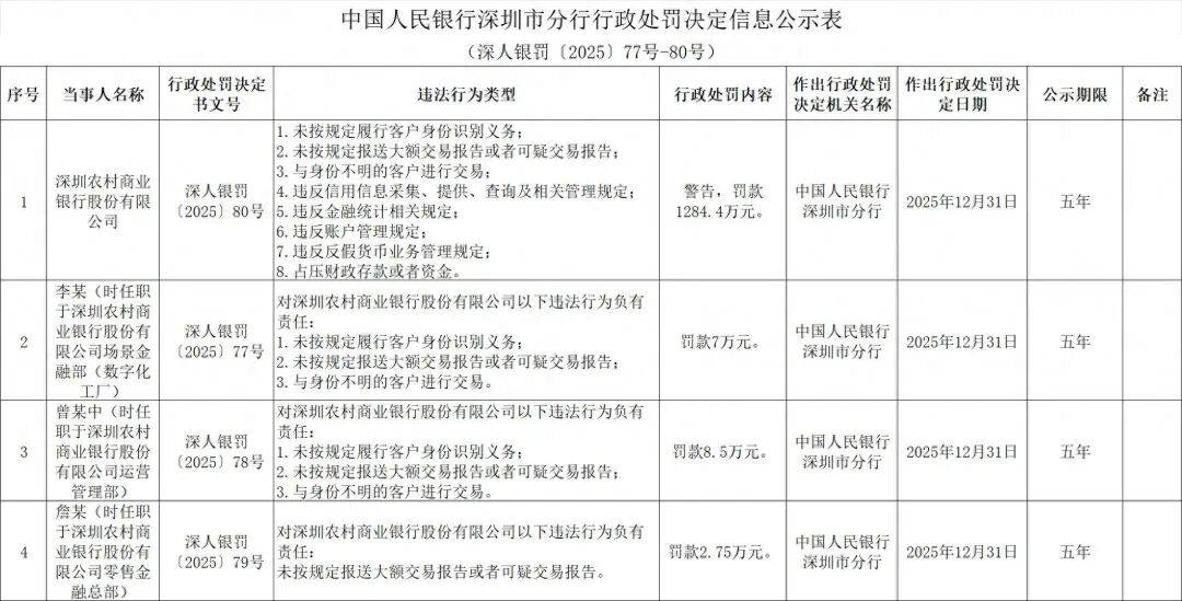 奥一新闻注意到,2025年12月31日,中国人民银行深圳市分行披露的一份行政处罚决定信息公示显示,深圳农村商业银行股份有限公司被警告,并罚款1284.4万元。