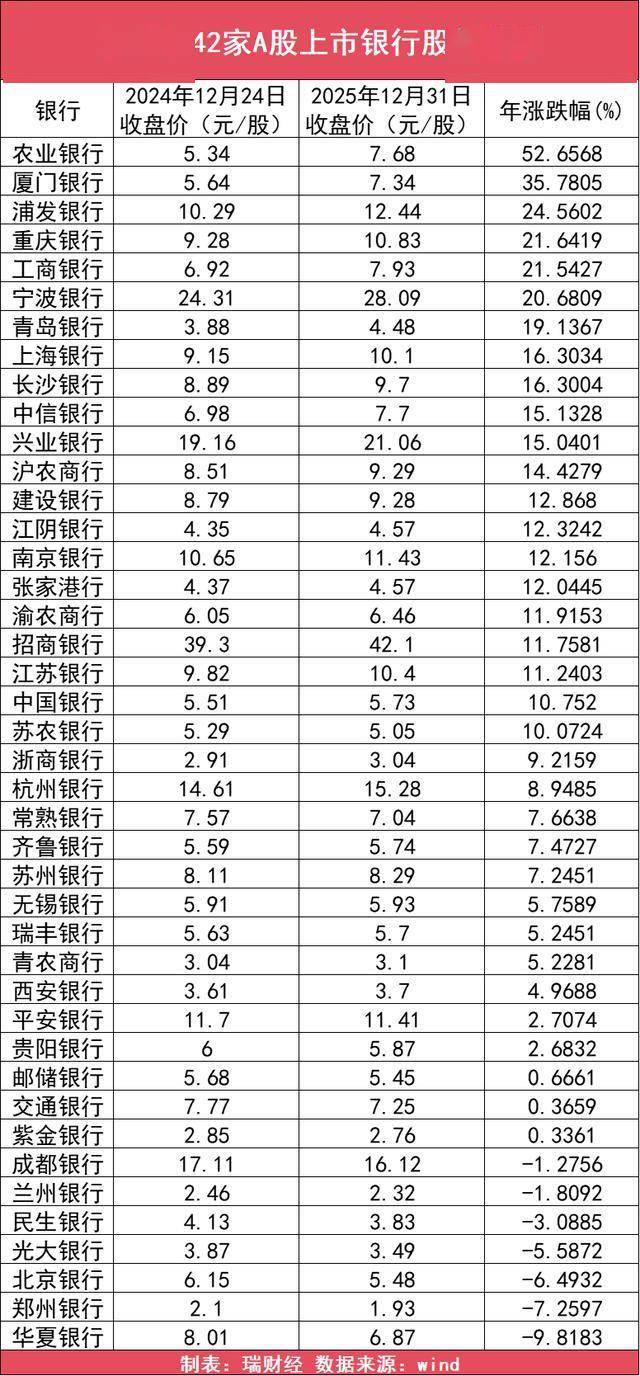 瑞财经统计,2025年,42家A股上市银行当中,共有35家银行实现全年股价上涨,其中涨幅超过10%的就有21家,整体表现较好。