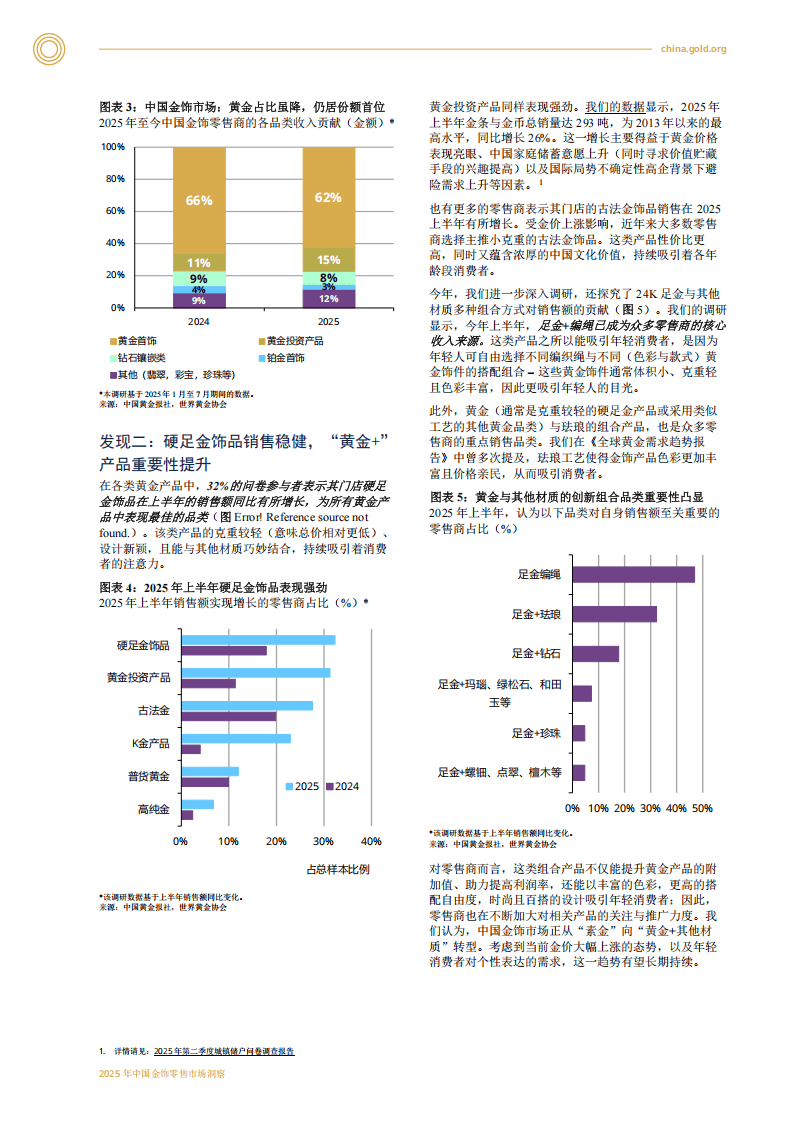 总体来看,2025年中国金饰市场在金价高企与竞争加剧的背景下,通过产品创新、场景升级与结构优化实现了消费额的稳定。“轻克重、精设计、多组合”成为产品核心趋势,“自戴”需求持续引领市场增长,年轻消费群体的潜力与多元品类的崛起将为行业发展注入持久动力。