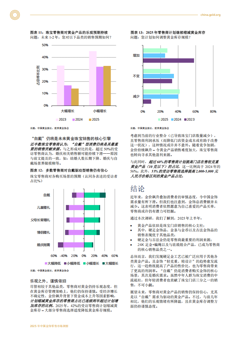 渠道与趋势方面,行业竞争加剧推动整合加速,主要珠宝品牌缩减门店数量。零售商对黄金产品未来1-2年的销售仍持乐观态度,47%预期销售额增长。库存策略上,42%的零售商计划缩减黄金库存,但60%以上计划提高轻克重产品占比,55%将增加2000-5000元价格区间产品供给。